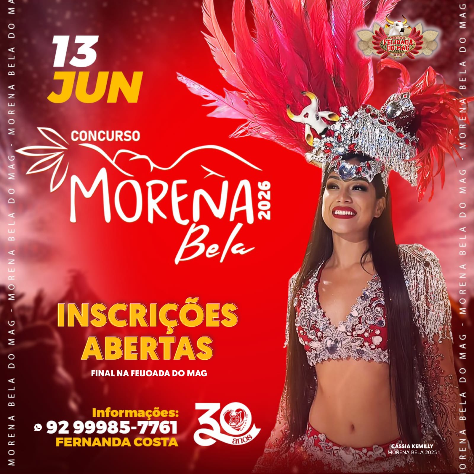 O Movimento Amigos do Garantido (MAG) anuncia a abertura das inscrições para o concurso “Morena Bela 2026”. A competição, que enaltece a beleza da mulher amazonense e a paixão pelo Boi Garantido, terá sua grande final no dia 13 de junho, durante a edição histórica da Feijoada de 30 anos do MAG. A vencedora receberá prêmios exclusivos.